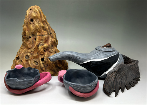 | Description: | Anteater themed tea set, includes teapot, cookie jar and two teacups. Hand built from clay and finished with acrylic paint. |
