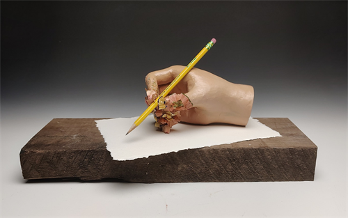 | Description: | This piece is designed to look like a hand holding a pencil, made of ceramic, acrylic paint, and pencil shavings. It represents being in a creative flow or hitting an artistic stride. |