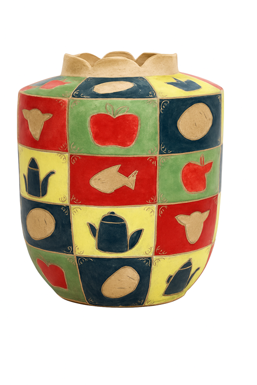 | Description: | The piece “Life Support” was inspired by a grain pot or a granary jar, which are used to store food. The tile design on the jar features the fundamentals of cuisine: grain, fruit, meat, and water. Every single person requires these resources to survive, and yet some lack access to them. This piece represents the crime of humanity against itself through the excessive hoarding of resources necessary to sustain life, while simultaneously wasting so much of it, and how this system rewards greed and punishes those who cannot afford it. Coil built with sgraffito |