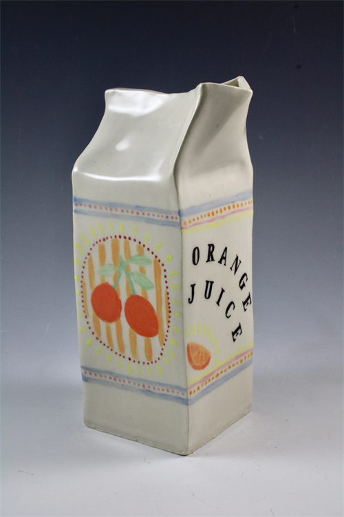 | Description: | Orange juice box built from slab and decorated with underglazes, freehand and with custom letter stencils |