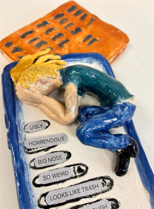 | Description: | Audrey entered this piece last year, and I felt that it was strong enough to attempt to enter it again. She has learned to express herself very effectively through her Clay work to discuss issues happening around her at school and that harm her friends and that she feels she doesn't have enough control over. By creating sculpture, she's expressed that it allows her to impact people through her art and hopefully address the problem. it's a very powerful piece in person. |