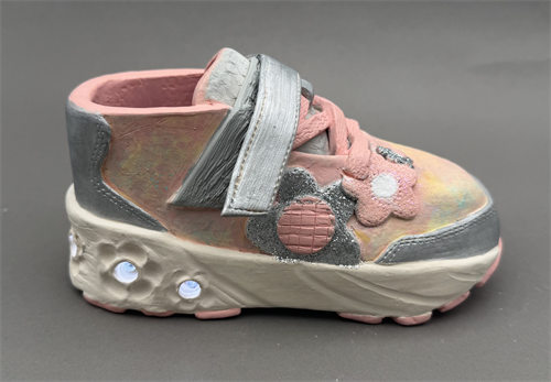 | Description: | Our First Steps Sparkled is a trompe l'oeil kid’s light-up shoe meant to capture the simple joys of young children. To achieve a “fool the eye” look, my piece is made to scale, with every detail, down to the sole, carefully considered. A self-made circuit lights up the piece. As we grow up, much of life becomes more centered around perfection; yet, the signature colors, chunky shape, sparkles, and misplaced shoe strap carry their own sort of perfection. Through the bold innocence of this piece, I aim to show how, rather than trying to reach perfection, each step of childhood is guided by wonder and curiosity that is perfect in and of itself. |