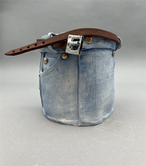 | Description: | "Worn In" is a sculptural cup I made to represent the overlap between the outward and inward embrace of femininity. To achieve a trompe l'oeil look, I used real denim to imprint the vessel, with the belt acting as a handle for my work. The rub-on-rub-off glazing method gives my skirt a worn-in, well-loved feeling. The skirt is often a symbol of femininity and has restricted women to fitting the ‘proper’ image. Through the casual look of my piece, I aim to show how femininity has been embraced in a way that reclaims power as a means of self-expression. |