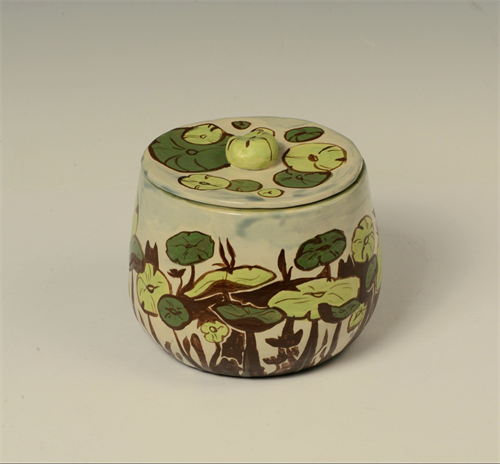 | Description: | A thrown jar with detailed surface design using various colors of underglaze to create lilypads. There is contrasting linework, and hidden in the shadows of the lilypads there are silhouettes of cats. The lid has an underglazed lilypad design and a handle shaped like a lilypad as well. The rim of the lid is a repeated bumpy pattern to mimic the circular shape of the lilypads as well. |