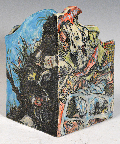 | Description: | I used an inlay technique for the contour lines and underglazes for the color in this slab built vessel. The design shows imagery of garbage in 4 different contexts: garbage in the home, landfills, fashion waste improperly disposed of on beaches, and old trash mixed in with natural parts of the environment. This weighs human impact on the environment and the fact that regardless of the value we place plastic objects, they will outlast us as the primary signs of our lives and existence. Integrated with the natural world, plastic pollution reshapes how we function. I used a full color palette and crowded composition to convey that it is a collective effect, not the result of a single action. I used textured glazes on the interior of the vessel to look like mold growth and waste on the inside of a dumpster and show beauty in things that have been purposefully ignored. |