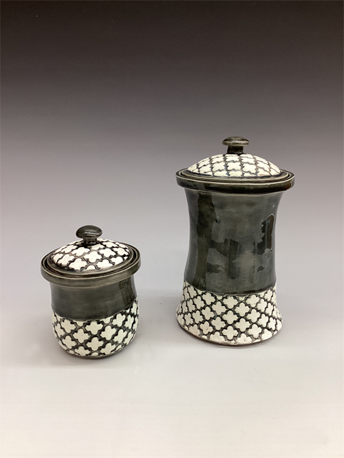 | Description: | Slab built jars with applied texture and inset lids. Glaze applied and wiped off raised texture. Dimensions are for the larger of the pair. Weight is an estimate. |