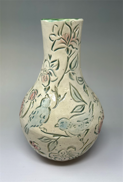 | Description: | Coil built, carved vase finished with underglaze and clear glaze |