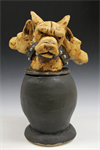 | Description: | Coil pot with sculptural lid in the form of Cerberus, the three-headed dog in mythology that guards the underworld. Each head expresses a different emotion. |