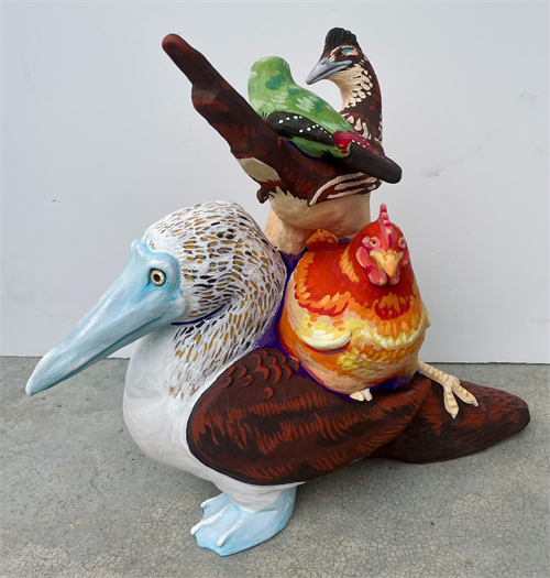 | Description: | It's a stack of birds, the species of birds getting smaller as they reach the top. There is a blue footed booby (a seabird), a hen, a greater roadrunner, and a red avadavat (a type of finch). This piece was inspired by the fable of the Bremen Town Musicians, a story about a stack of barn animals working together to impersonate a person. Each bird represents a part of me, as if they all together can impersonate me as a whole. I made sure to use vibrant colors, avoiding using black to mix the darker shades. |