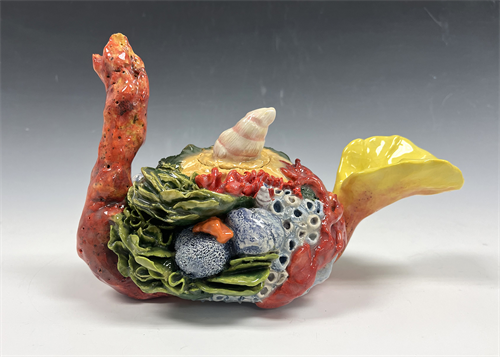| Description: | Handbuilt teapot in the form of a coral reef with a seashell lid |