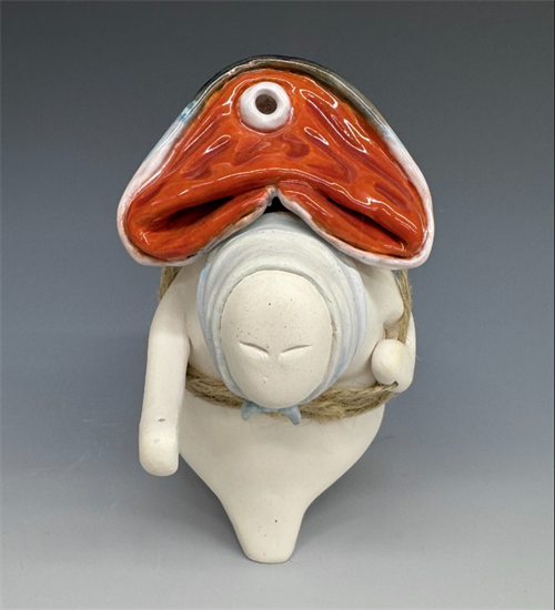 | Description: | "For My Daughter's Wedding" is a piece about sacrificing for the people you love. The three legged Figure represents an old woman, a mother, who is laboriously carrying a large fish. Back bending under the weight she trudges forward, love for her daughter is the only thing still moving her legs. The old woman sacrifices comfort and safety to complete her task. This coil built sculpture juxtaposes shiny, fresh fish with the old womans dull matte form to create visual interest. |