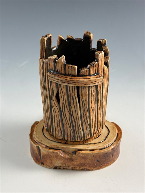 | Description: | Hand-built cup that resembles wood planks, sitting on a tree stump, exemplifying the juxtaposition of a natural material vs. man-made object made of such |