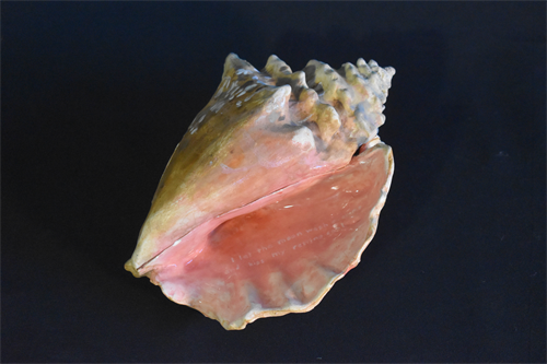| Description: | This ceramic sculpture is a conch seashell that can be opened to reveal the interior. The exterior is realistically textured and the interior is glazed in shades of pink and coral. Inside the shell, faint handwritten text draws the viewer closer. |