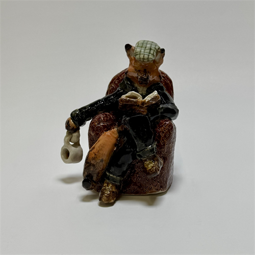 | Description: | Hand-built and sculpted, this piece depicts a fox seated in a chair, reading a book while holding a coffee cup, capturing a quiet and thoughtful moment. Slips were applied to add color and surface detail, and the work was finished with glazes to enhance texture and bring the character to life. |