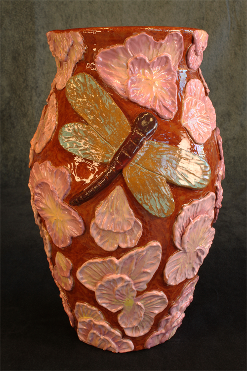 | Description: | Traditional ceramic vase form with additive floral design and sculptural dragonflies. Rustic and and rich warm tone element glazes utilized for surface treatment. |