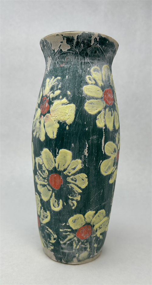 | Description: | Wheel thrown vase, I colored porcelain slip with mason stains, then slip transfer onto the surface putting down multiple layers then a white underglaze wash to add highlights and details. High fired to cone 10 reduction |