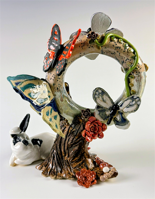 | Description: | Vertical ring balanced on a tree stump covered in butterflies and with a little bunny at the bottom |